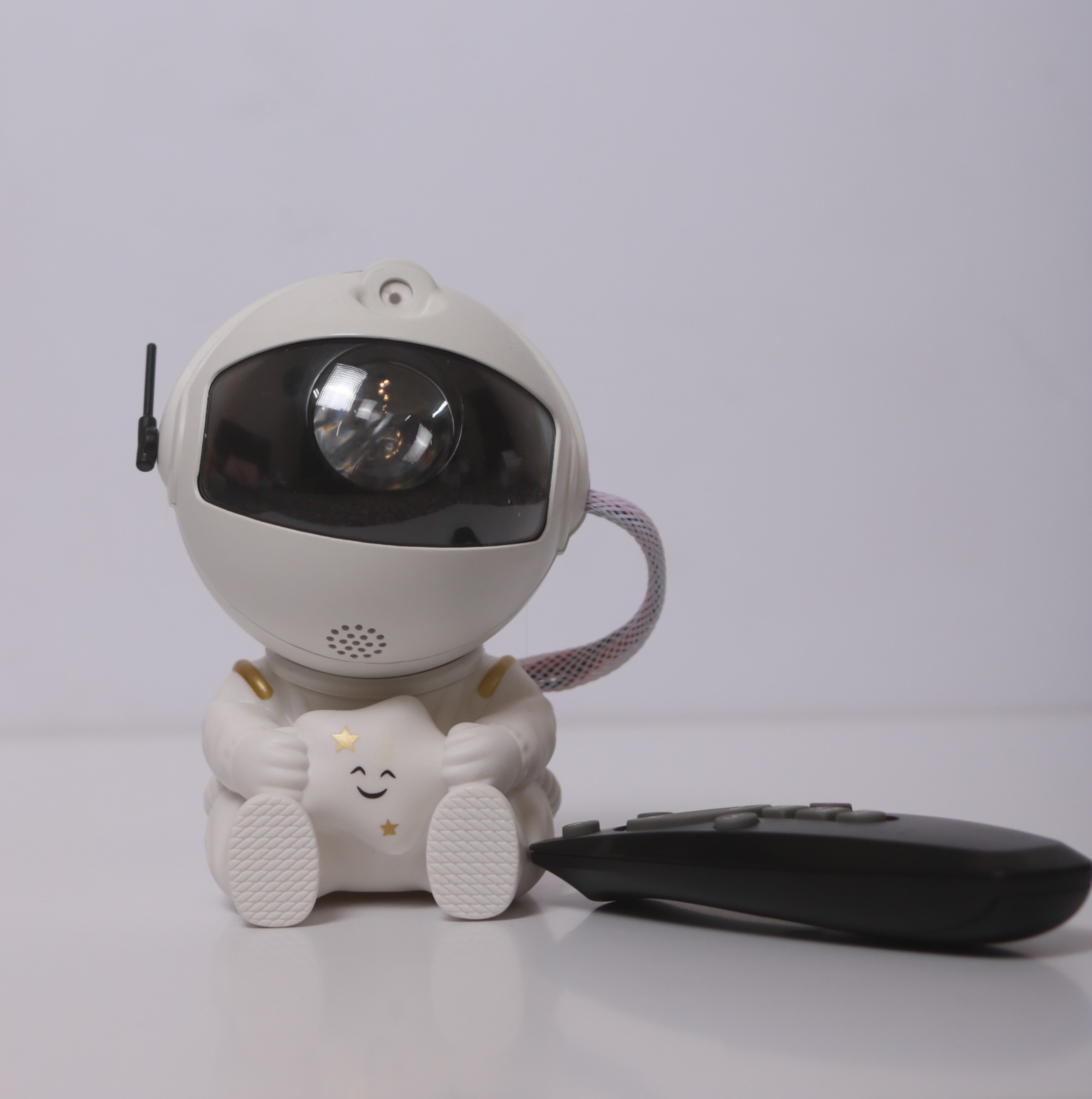 پروژکتور کهکشانی طرح فضانورد نشسته یک چراغ خواب با قابلیت پخش افکت تصویر زنده کهکشانی بر روی سقف و دیوار اتاق است که به همراه افکت لیزر ستاره ای حس یک سفر کهکشانی را قبل از خواب به شما میدهد . تلفیق همزمان تصویر زنده کهکشانی و لیزر ستاره ای جذابیت اتاق خواب شما را چندین برابر میکند . این محصول دارای ریموت کنترل نیز می باشد که میتواند نور پرژکتور یا لیزر را کم یا زیاد و یا برای روشن ماندن محصول تایمر تعریف کنید . برای روشن کردن این محصول باید از آداپتور موبایل استفاده کنید و از طریق کابل داخل بسته بندی آن را شارژ نمایید.