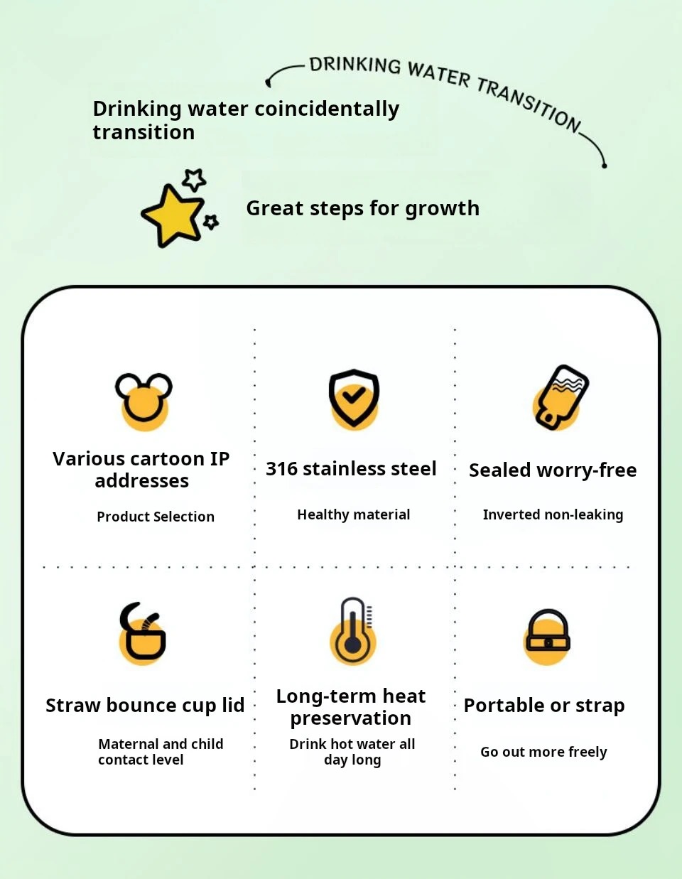 سبک: لیوان فلاسک جنس مخزن داخلی: استیل ضد زنگ ۳۱۶ جنس پوسته: استیل ضد زنگ عملکرد حفظ حرارت: ۶-۱۲ ساعت جنس: استیل ضد زنگ ۳۱۶ سبک: کارتونی عملکردها: قابل حمل، عایق حرارتی، ضد ضربه درجه کیفیت محصول: محصول درجه یک قابل استفاده: کودکان قابل استفاده: خودرو، دفتر، فضای باز، مدرسه