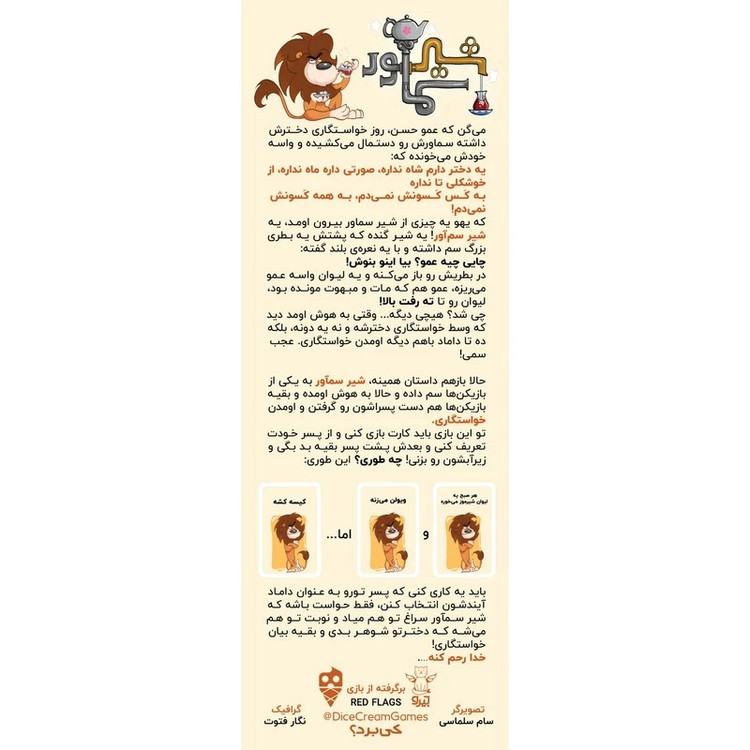 بازی شیر سماور یک بازی کارتی و بامزه مناسب مهمانیها که در آن قرار هست که به خواستگاری بریم و همه بازیکنان با کارتهای بازی از پسر خودشون تعریف میکنن و پسر بقیه خواستگارها رو دیس میکنن. اینجاس که پدر/ مادر عروس باید تصمیم بگیره کی لیاقت غلامی خانوادهاش رو داره.